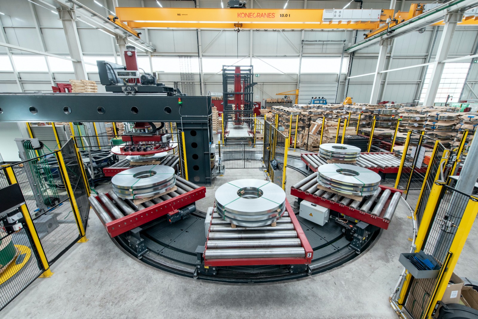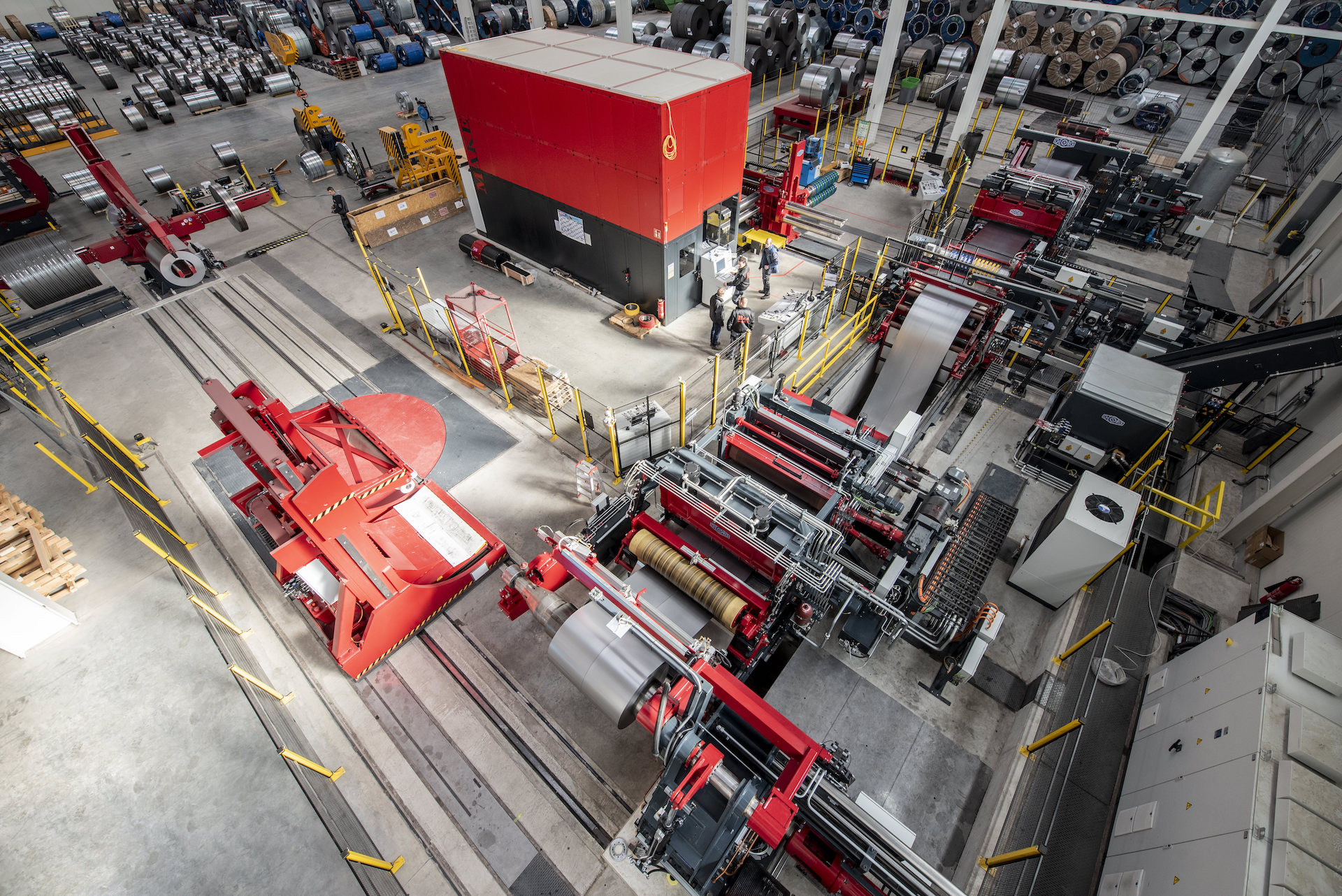 Sie wurde individuell für unsere spezifischen Anforderungen konzipiert, um den wachsenden Anforderungen unsere Kunden optimal entsprechen zu können. Um die im Stahl-Service notwendige Flexibilität und Effizienz der Anlage zu gewährleisten, wurden ein sehr hoher Automatisierungsgrad und hochtechnologisierte mechanische Prozesskomponenten, wie beispielsweise der Messerbau-Roboter und die automatische Verpackungsanlage, integriert.